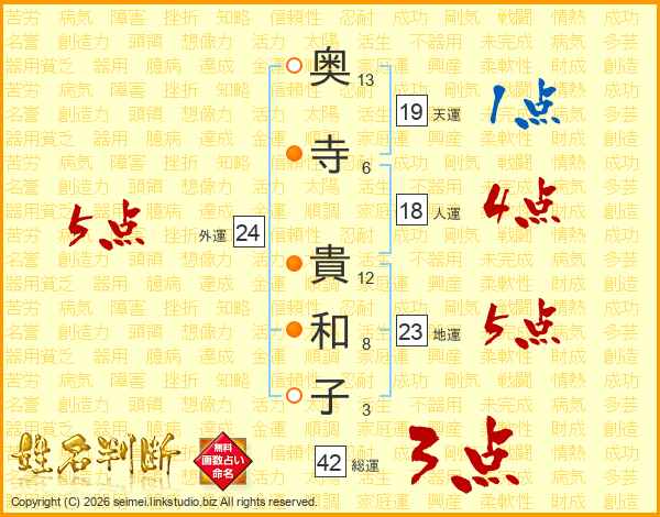 奥(13画)寺(6画) 貴(12画)和(8画)子(3画)