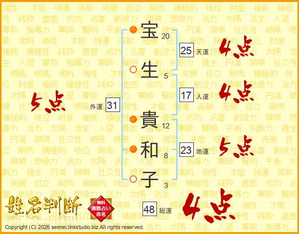 宝(20画)生(5画) 貴(12画)和(8画)子(3画)