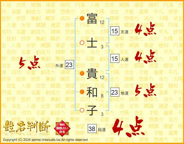 富(12画)士(3画) 貴(12画)和(8画)子(3画)