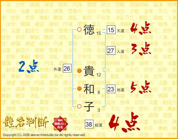 徳(15画) 貴(12画)和(8画)子(3画)