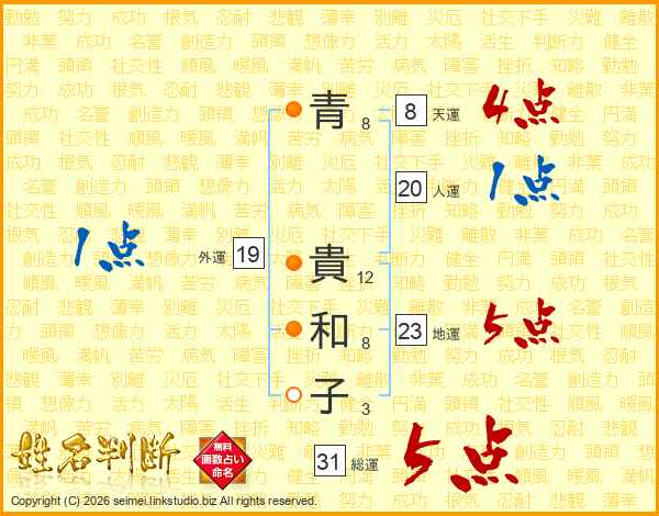 青(8画) 貴(12画)和(8画)子(3画)