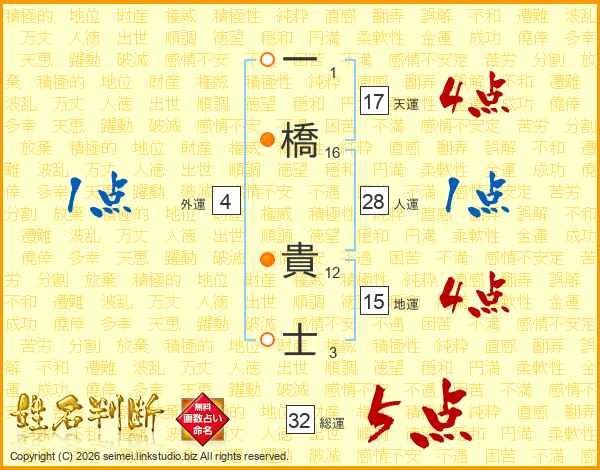 一橋貴士さんの総運は32画の5点!
