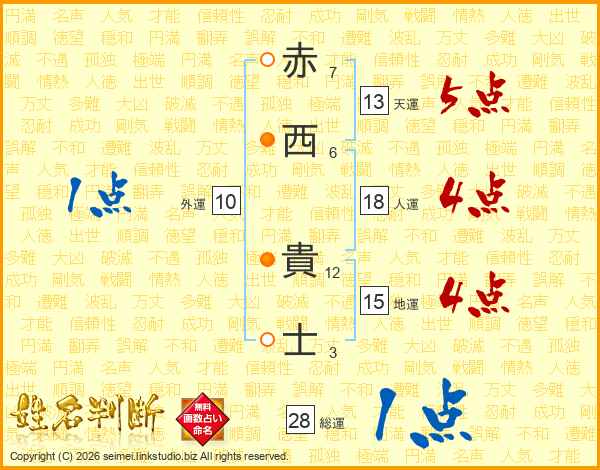 赤(7画)西(6画) 貴(12画)士(3画)