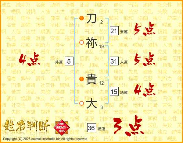 刀祢貴大さんの総運は36画の3点!