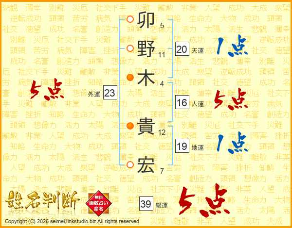 卯(5画)野(11画)木(4画) 貴(12画)宏(7画)