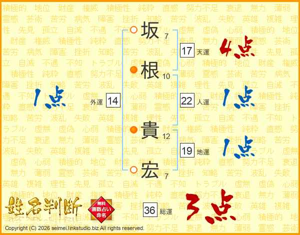 坂(7画)根(10画) 貴(12画)宏(7画)