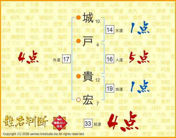 城(10画)戸(4画) 貴(12画)宏(7画)
