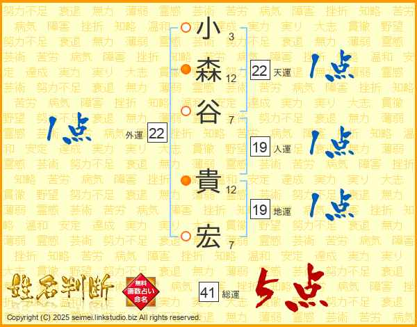 小(3画)森(12画)谷(7画) 貴(12画)宏(7画)