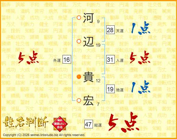 河(9画)辺(19画) 貴(12画)宏(7画)