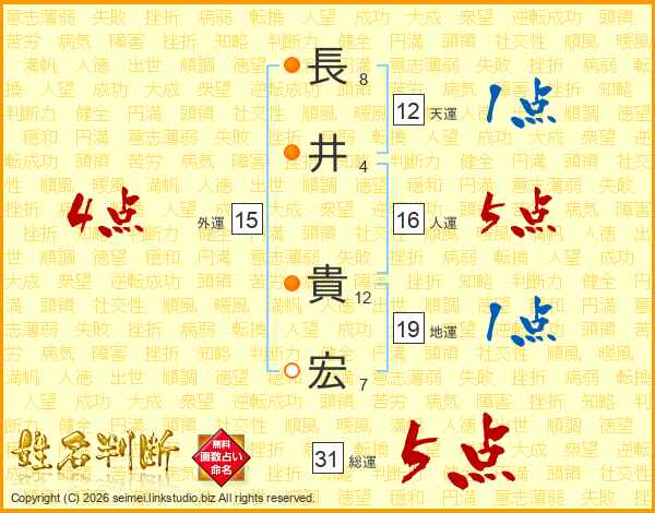 あなたの人生を表す1番重要な運勢です。生涯を通じて影響する総合運となり、主に50歳以降の晩年期に影響を及ぼします。苗字と名前の合計画数。