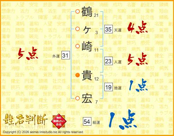鶴(21画)ヶ(3画)崎(11画) 貴(12画)宏(7画)