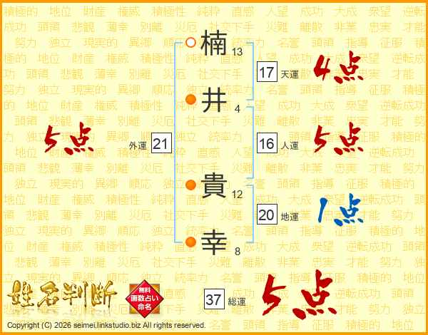 楠(13画)井(4画) 貴(12画)幸(8画)