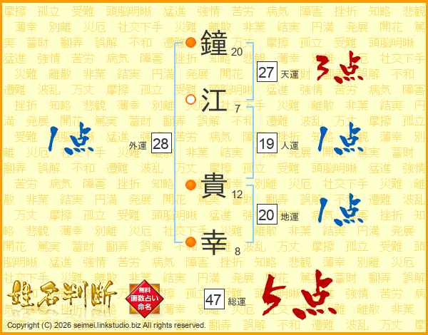 鐘(20画)江(7画) 貴(12画)幸(8画)