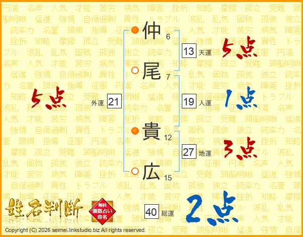 仲(6画)尾(7画) 貴(12画)広(15画)