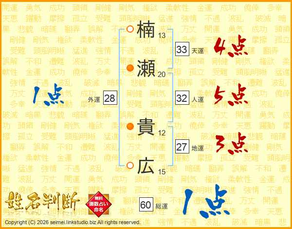 楠(13画)瀬(20画) 貴(12画)広(15画)