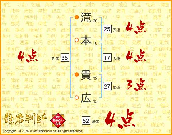 滝(20画)本(5画) 貴(12画)広(15画)