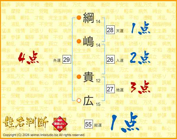 綱(14画)嶋(14画) 貴(12画)広(15画)