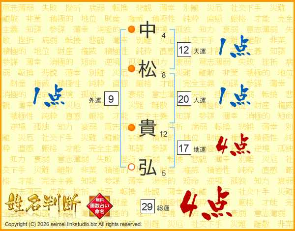 中(4画)松(8画) 貴(12画)弘(5画)
