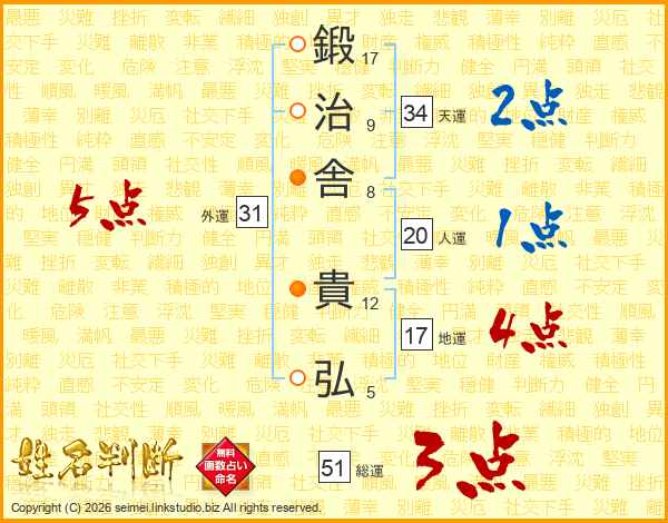 鍛(17画)治(9画)舎(8画) 貴(12画)弘(5画)