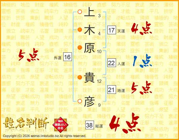 上(3画)木(4画)原(10画) 貴(12画)彦(9画)