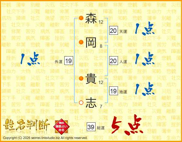 あなたの人生を表す1番重要な運勢です。生涯を通じて影響する総合運となり、主に50歳以降の晩年期に影響を及ぼします。苗字と名前の合計画数。