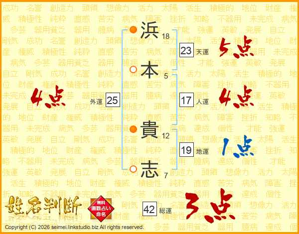 浜(18画)本(5画) 貴(12画)志(7画)