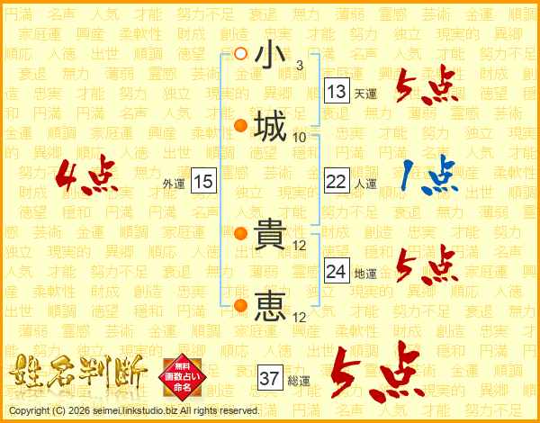 小(3画)城(10画) 貴(12画)恵(12画)