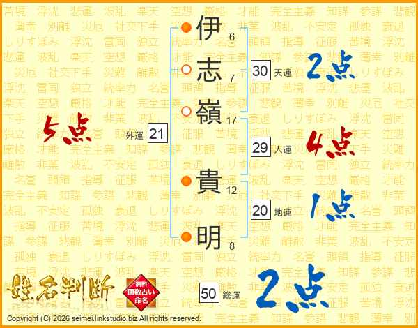 伊(6画)志(7画)嶺(17画) 貴(12画)明(8画)