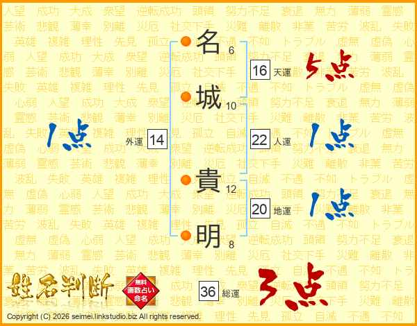 名(6画)城(10画) 貴(12画)明(8画)