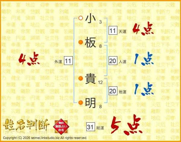生活面を象徴する運勢です。外部から受ける影響力を表し、結婚運、家庭運や職場、環境への順応性を表します。総運から人運を引いた画数。姓や名が1文字の場合を除く。