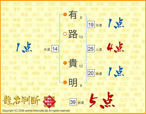 有路貴明さんの総運は39画の5点!