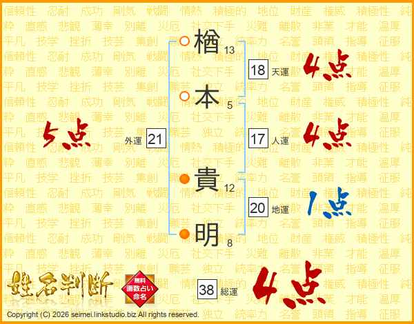 楢(13画)本(5画) 貴(12画)明(8画)