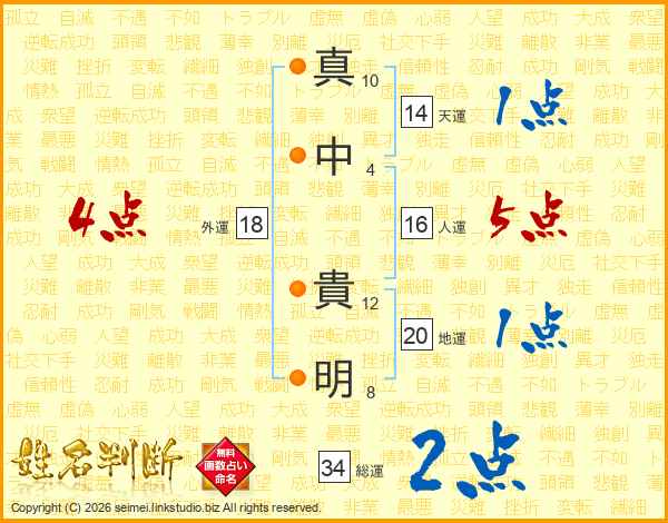 真(10画)中(4画) 貴(12画)明(8画)