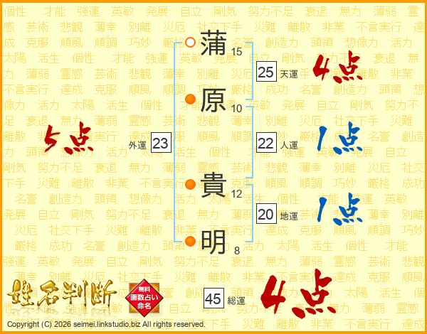 蒲(15画)原(10画) 貴(12画)明(8画)