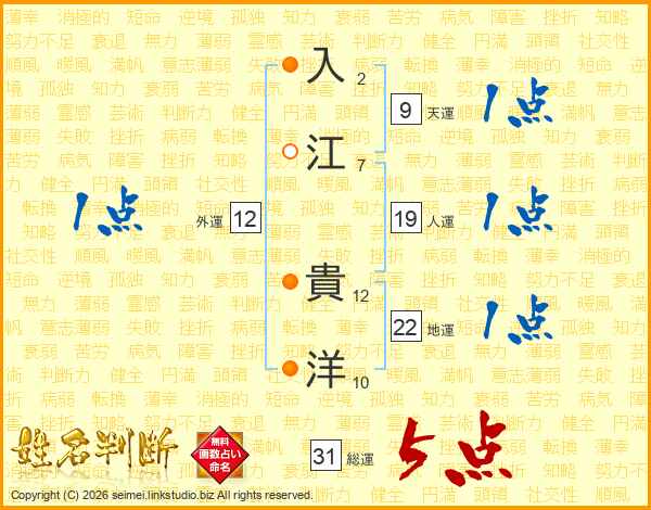 入(2画)江(7画) 貴(12画)洋(10画)