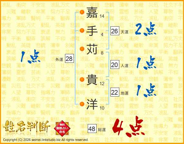 嘉手苅貴洋さんの天運は26画の2点!