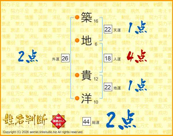 あなたの人生を表す1番重要な運勢です。生涯を通じて影響する総合運となり、主に50歳以降の晩年期に影響を及ぼします。苗字と名前の合計画数。