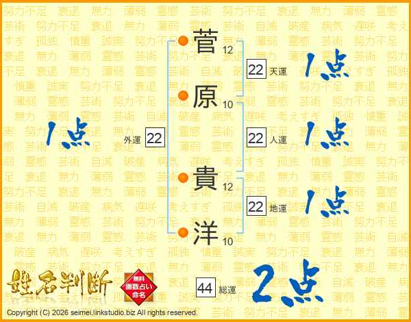 菅(12画)原(10画) 貴(12画)洋(10画)