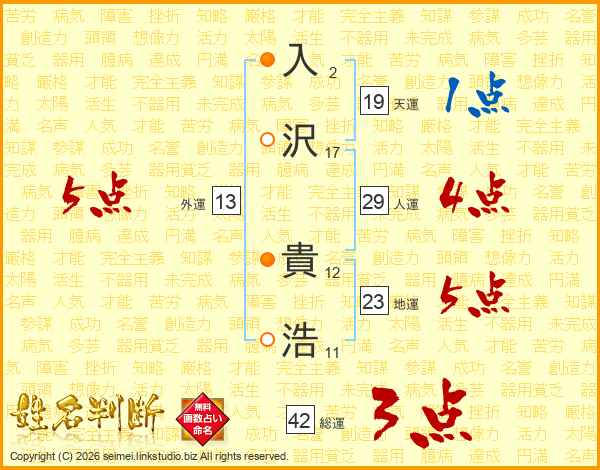 入(2画)沢(17画) 貴(12画)浩(11画)