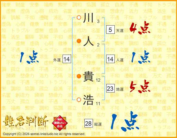 川(3画)人(2画) 貴(12画)浩(11画)