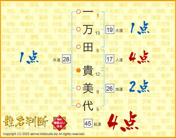 一(1画)万(13画)田(5画) 貴(12画)美(9画)代(5画)