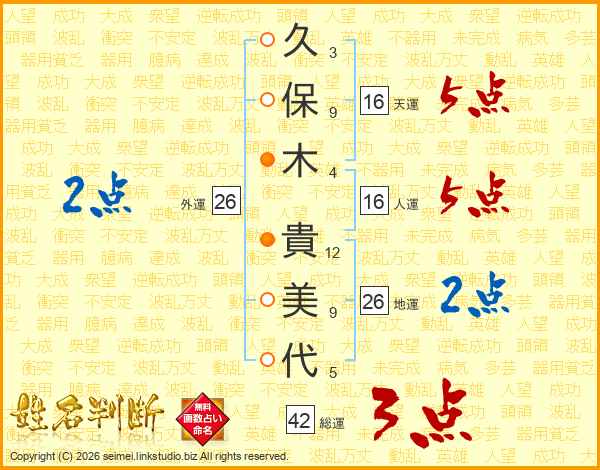 久(3画)保(9画)木(4画) 貴(12画)美(9画)代(5画)