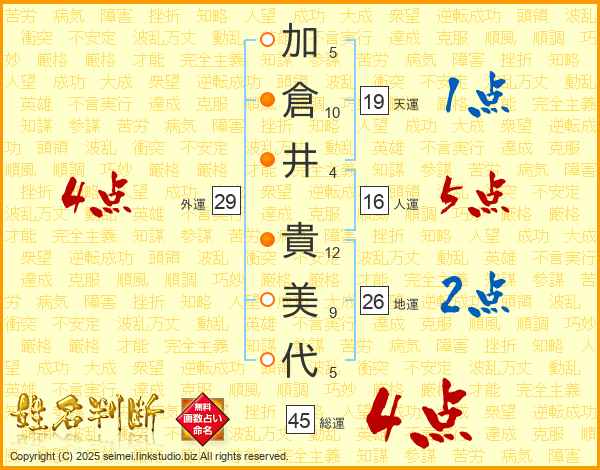加(5画)倉(10画)井(4画) 貴(12画)美(9画)代(5画)