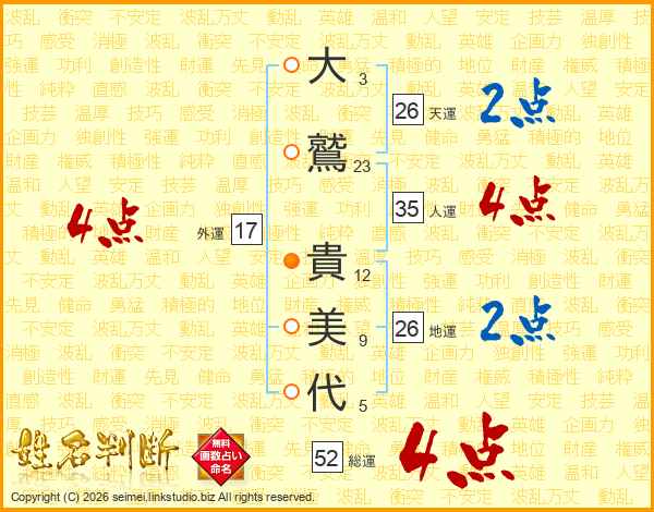 大(3画)鷲(23画) 貴(12画)美(9画)代(5画)
