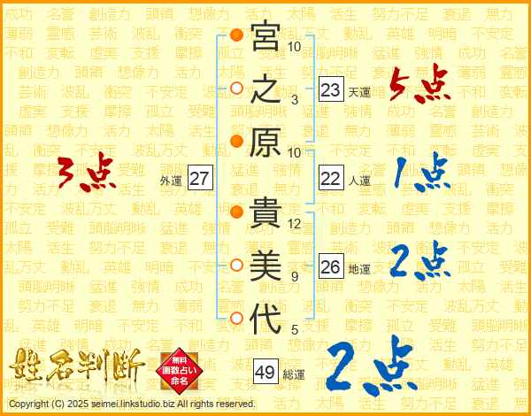 宮(10画)之(3画)原(10画) 貴(12画)美(9画)代(5画)