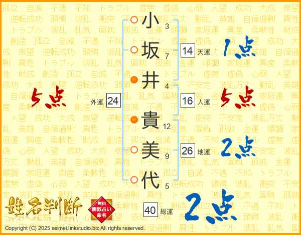 小(3画)坂(7画)井(4画) 貴(12画)美(9画)代(5画)