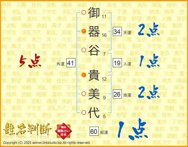御(11画)器(16画)谷(7画) 貴(12画)美(9画)代(5画)
