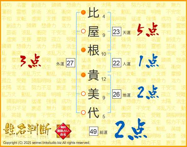 比(4画)屋(9画)根(10画) 貴(12画)美(9画)代(5画)