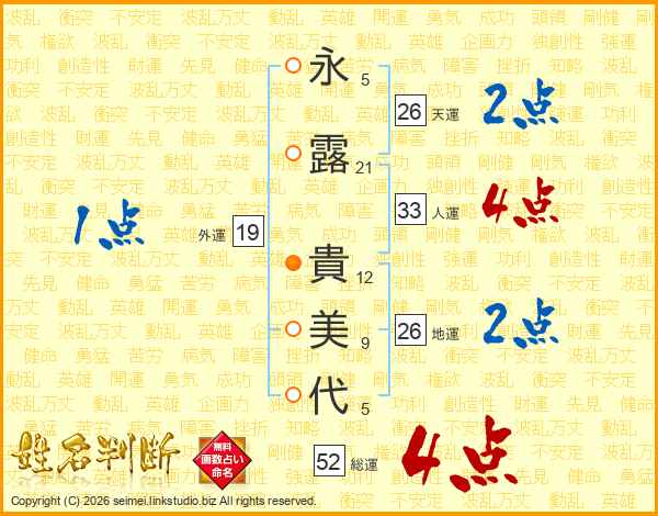 永(5画)露(21画) 貴(12画)美(9画)代(5画)
