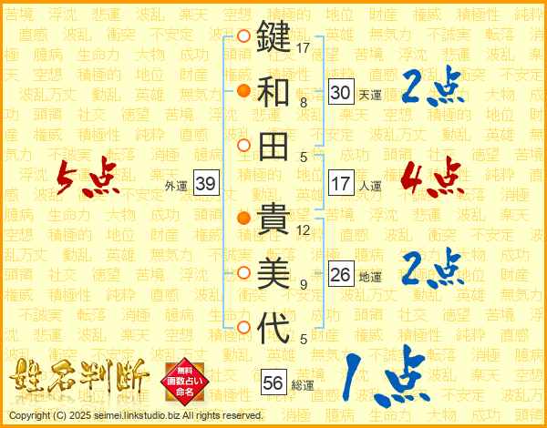 鍵和田貴美代さんの天運は30画の2点!